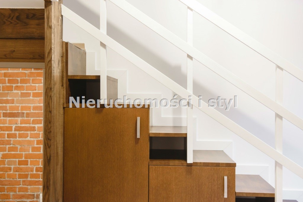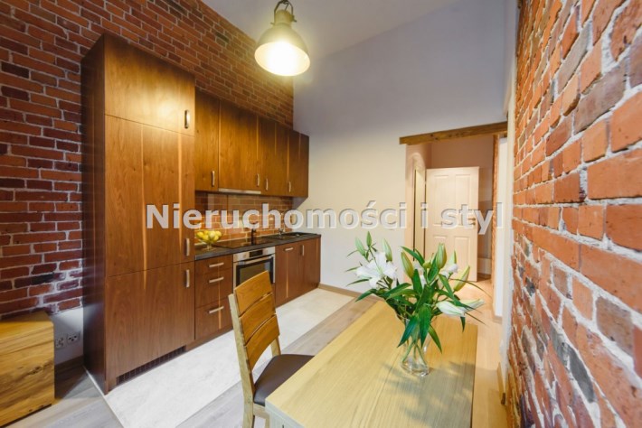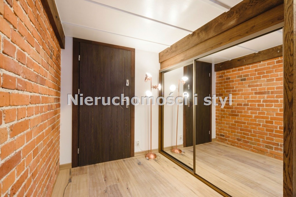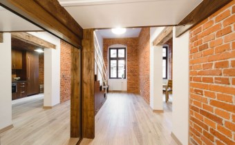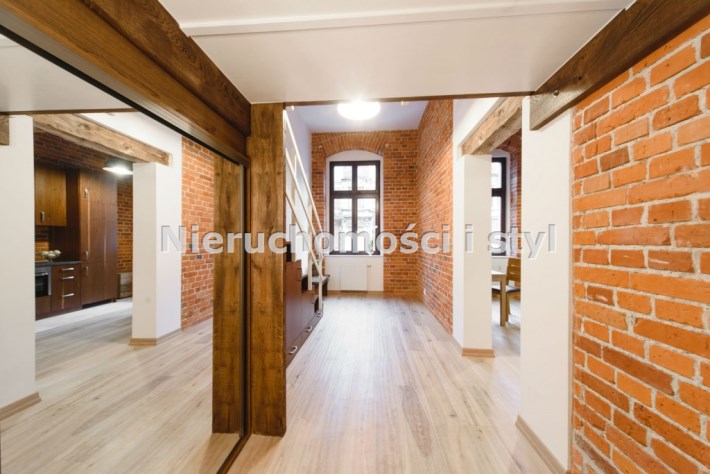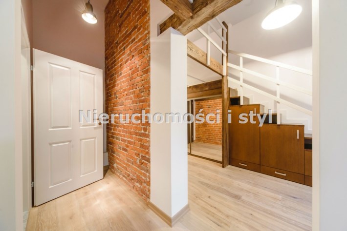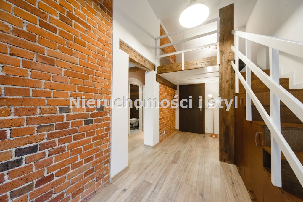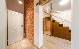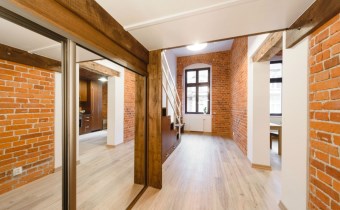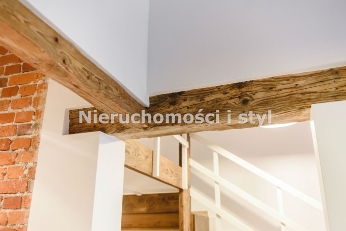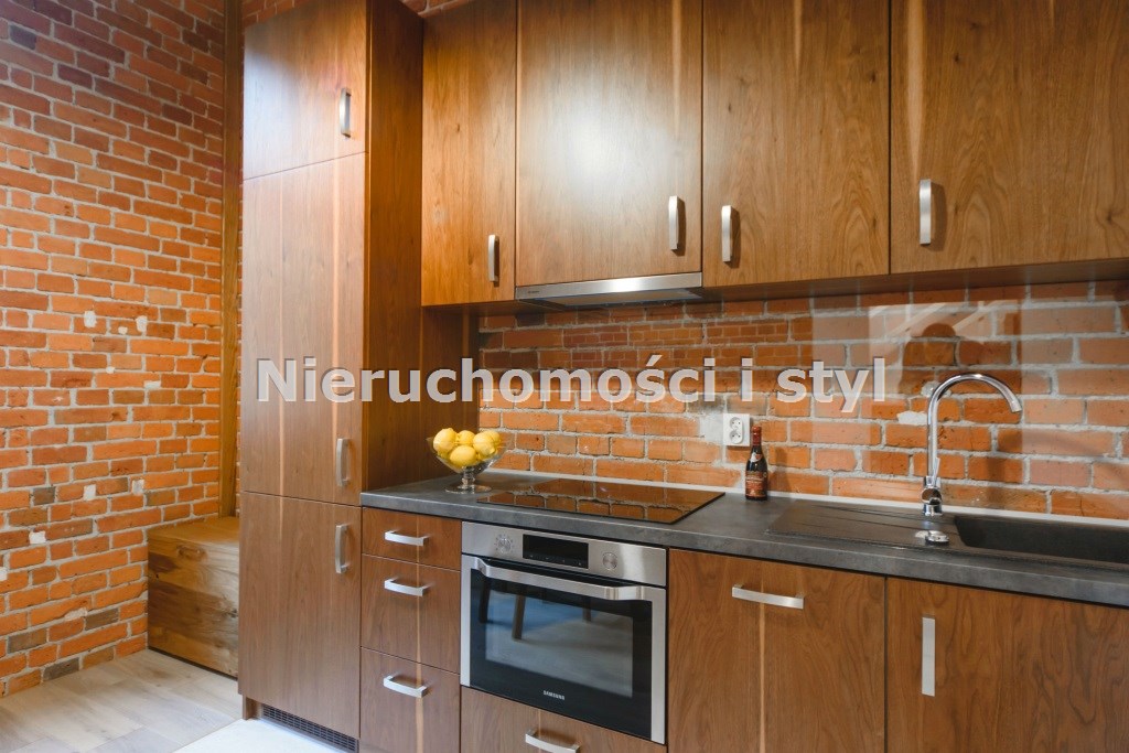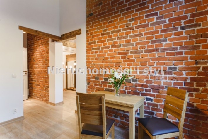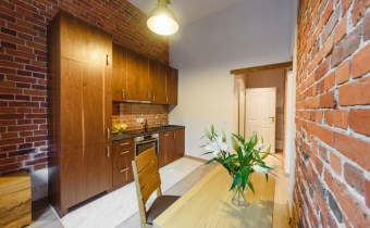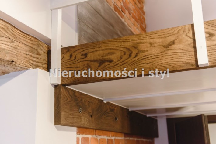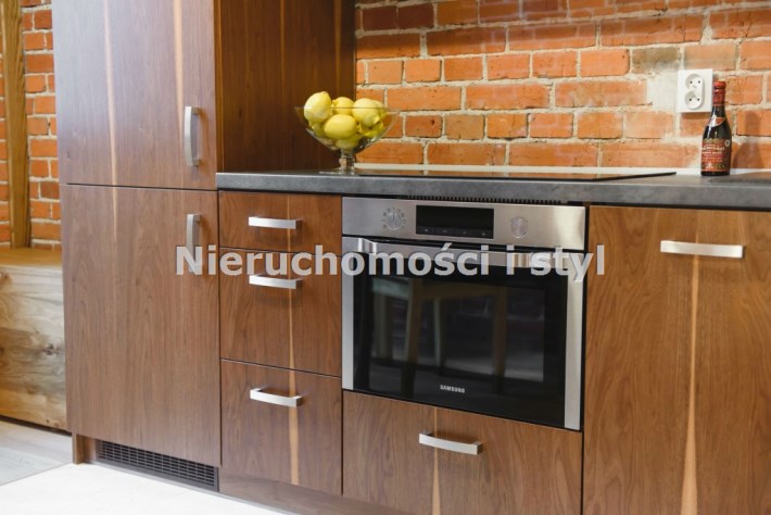 Mieszkanie wykończone w wysokiej jakości naturalnych materiałach- drewniana podłoga oraz antresola, meble kuchenne. Łazienka kamień naturalny. Pozostawiona oryginalna odrestaurowana przedwojenna cegła.