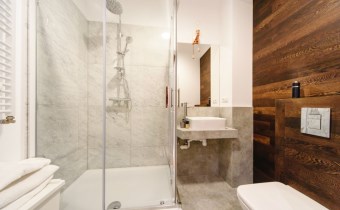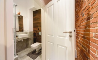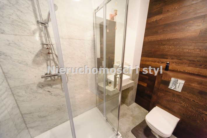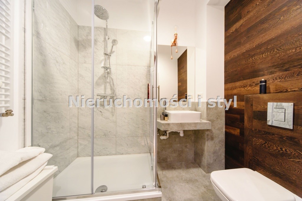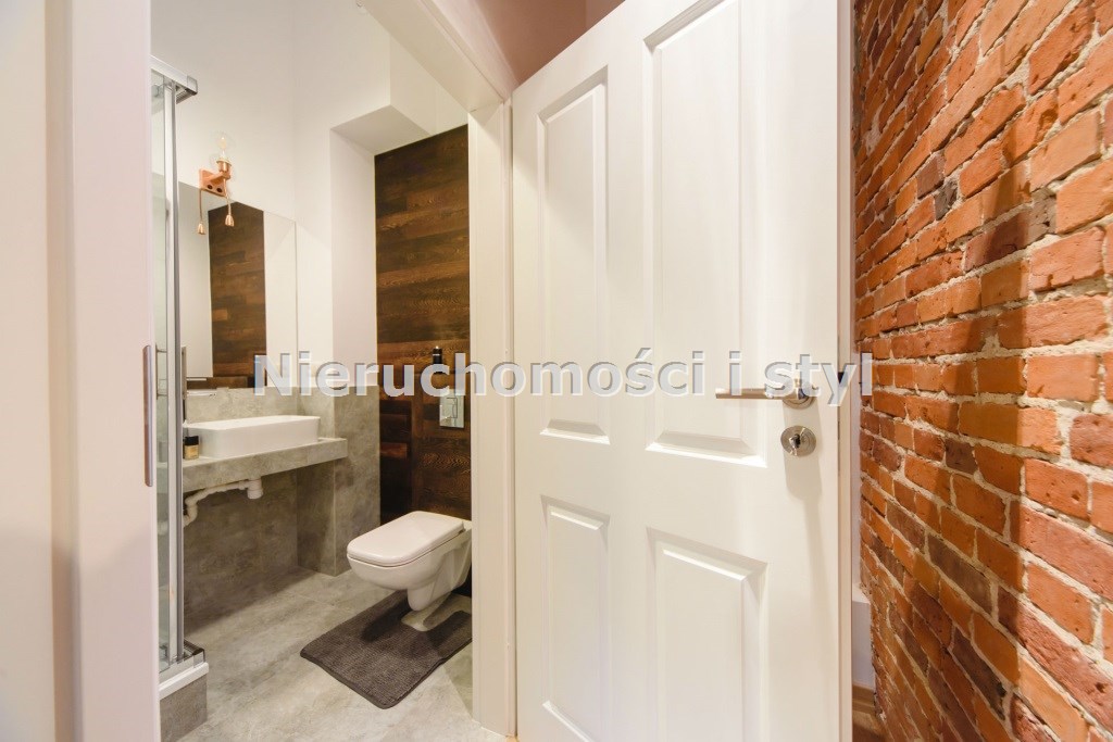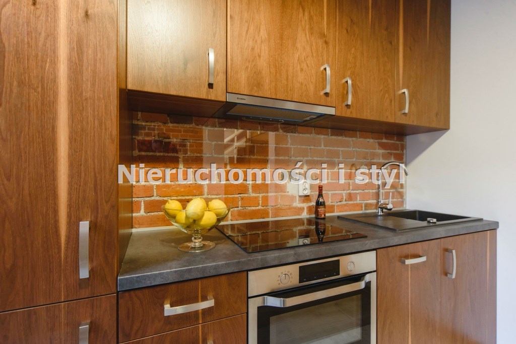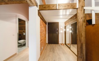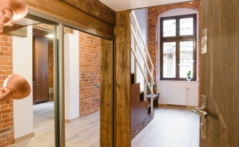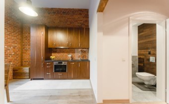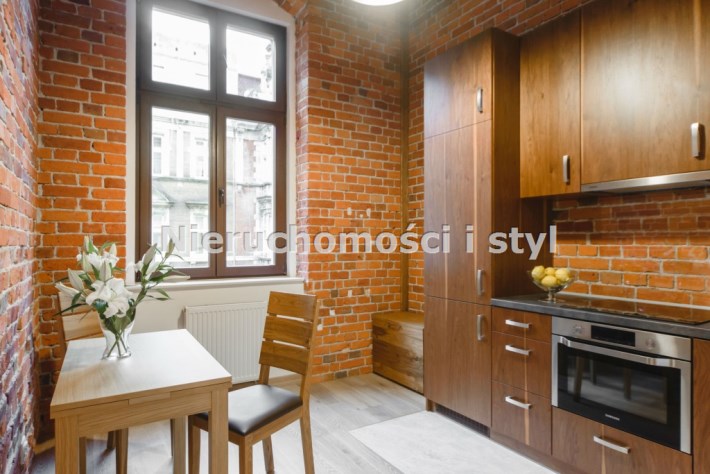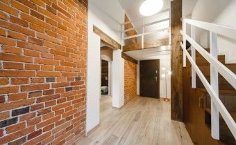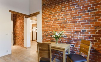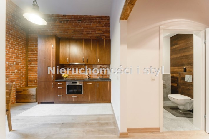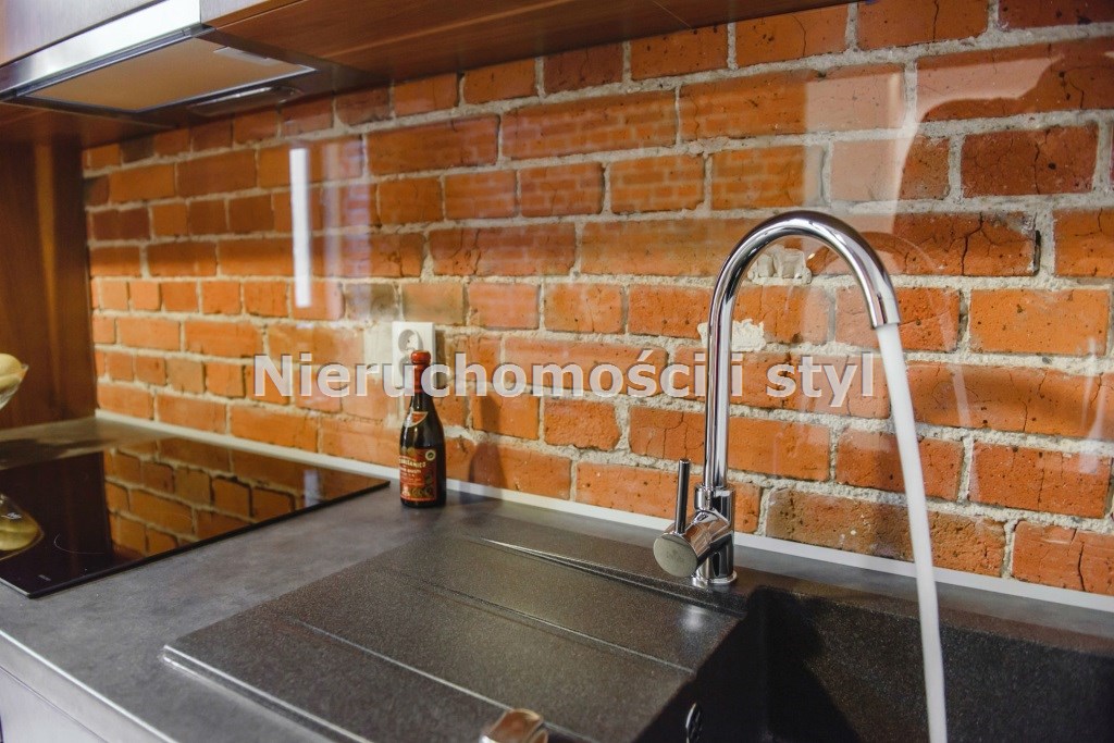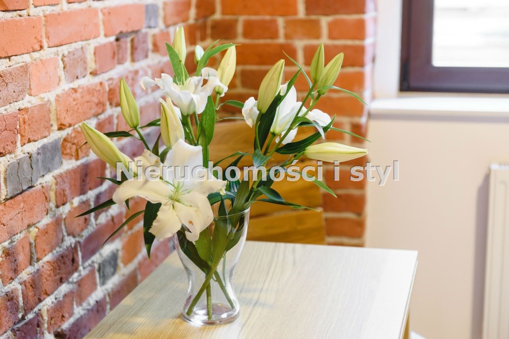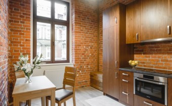 Mieszkanie wykończone w wysokiej jakości naturalnych materiałach- drewniana podłoga oraz antresola, meble kuchenne. Łazienka kamień naturalny. Pozostawiona oryginalna odrestaurowana przedwojenna cegła.